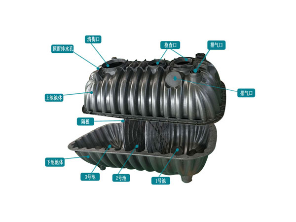 三格化糞池不僅有復雜的加強筋增加甕體承重,化糞池內部還有兩個隔板支撐,另加一條拉桿做拉伸,進一步防止化糞池在埋地使用過程中發(fā)生變形、坍塌等情況。